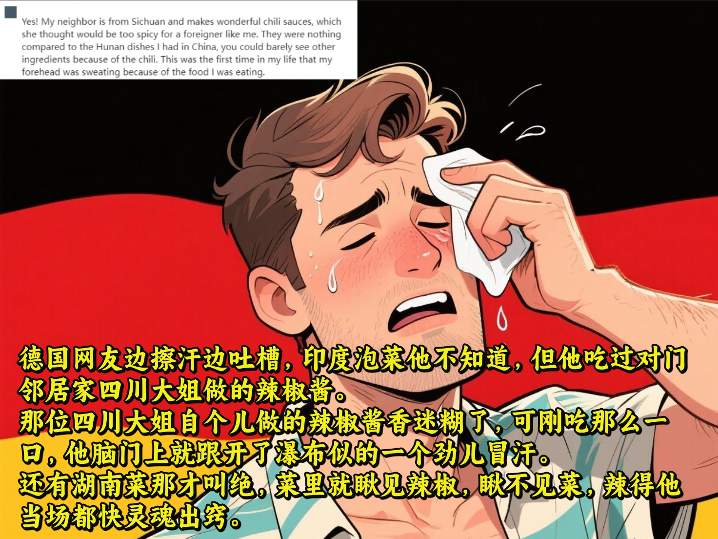 ❗️德国网友一边擦汗一边说:“印度泡菜他不太了解,但他尝过对门邻居家四川大姐做的辣椒酱。”