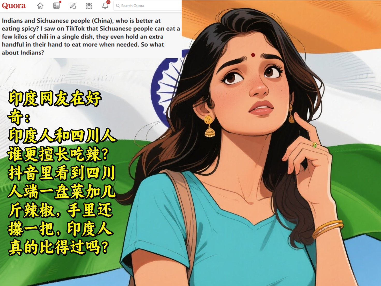❓在外网最大的问答平台上,印度网友对吃辣的相关事情好奇起来:印度人和四川人谁更能吃辣?在抖音看到四川人端一盘菜加几斤辣椒,手上还拿着一把辣椒,印度人能和他们比吗?