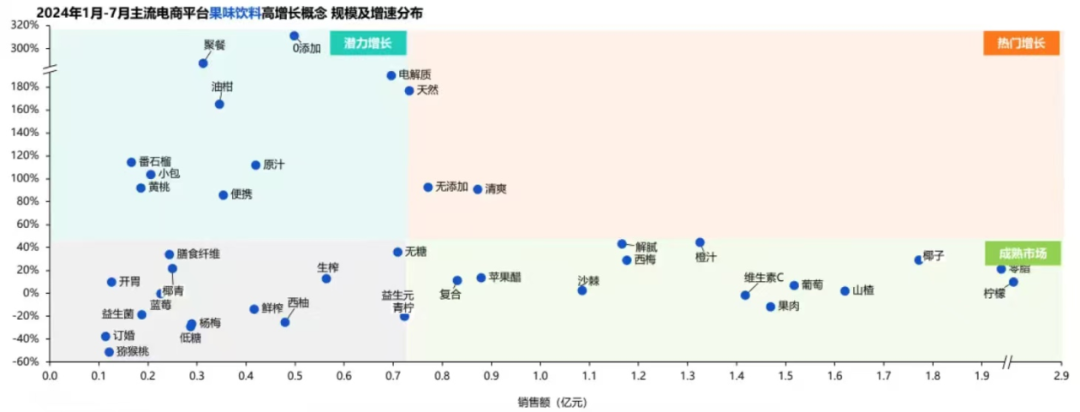尽管纯果蔬汁 / 纯果汁销售额同比下滑12.1% ,但在消费者健康意识崛起的当下,代表高品质、少添加的纯果汁产品,正契合大众对天然、营养饮品的需求,有望扭转下滑局势。而果味 / 风味 / 果汁饮料凭借丰富的口味,持续吸引消费者。