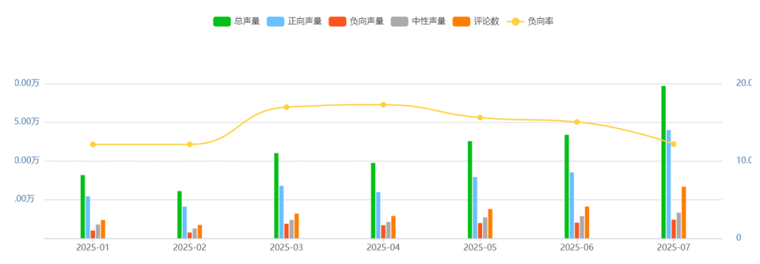 2025 年1 - 7 月,健康果汁相关话题声量数据呈现波动增长趋势。总声量在7月达到峰值,正向声量随总声量提升而增长,反映出消费者对健康、果汁等话题的持续关注。各月负向率相对平稳,说明产品口碑较稳定。评论数随时间递增,体现消费者参与讨论的热情高,侧面印证健康果汁类饮品在市场中受关注度不断攀升,为品类发展营造了积极的舆论环境 。