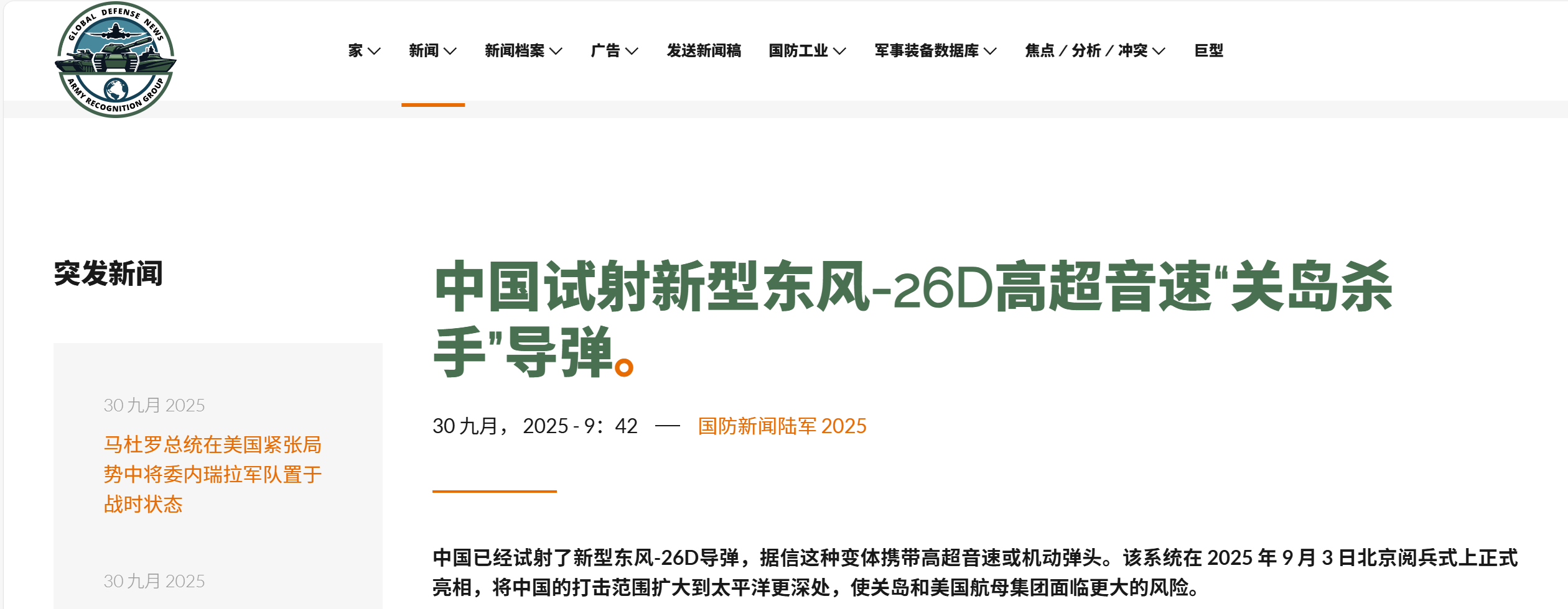 军队识别网站表示,中国试射新型东风-26D高超音速“关岛杀手”导弹,也只是该网站撰稿人阿兰·塞尔瓦斯(Alain Servaes),个人基于相关军事知识的猜测而已。