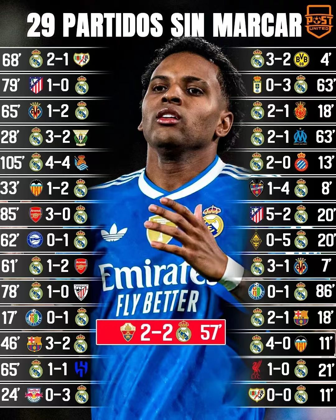 相对于本场比赛结束后皇马的排名,皇马球员罗德里戈的表现,则是球迷们更加关注的焦点,在本场比赛中,罗德里格在比赛第72分钟替补登场,但表现平平,未能扮演救世主的角色。同时,在本场比赛结束后,罗德里戈也迎来了自己连续第30场比赛未进球的尴尬纪录。而此前,上一个在皇马效力的球员30场球荒的球员是马里亚诺。