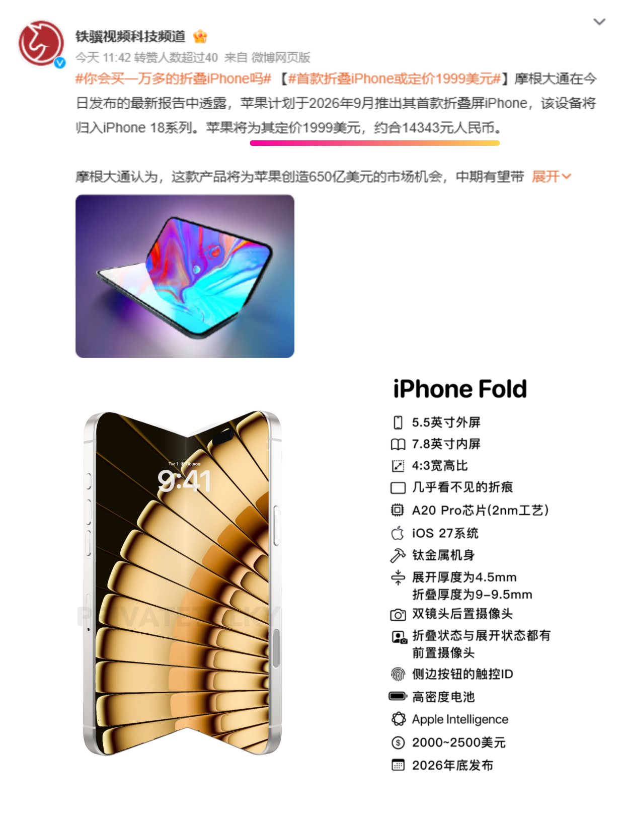 预计2026年9月开售,售价14000+,折叠屏iPhone可能随iPhone 18系列一起发布!📱大胆预测一波,折叠屏iPhone国外会卖爆,国内就很难说了。