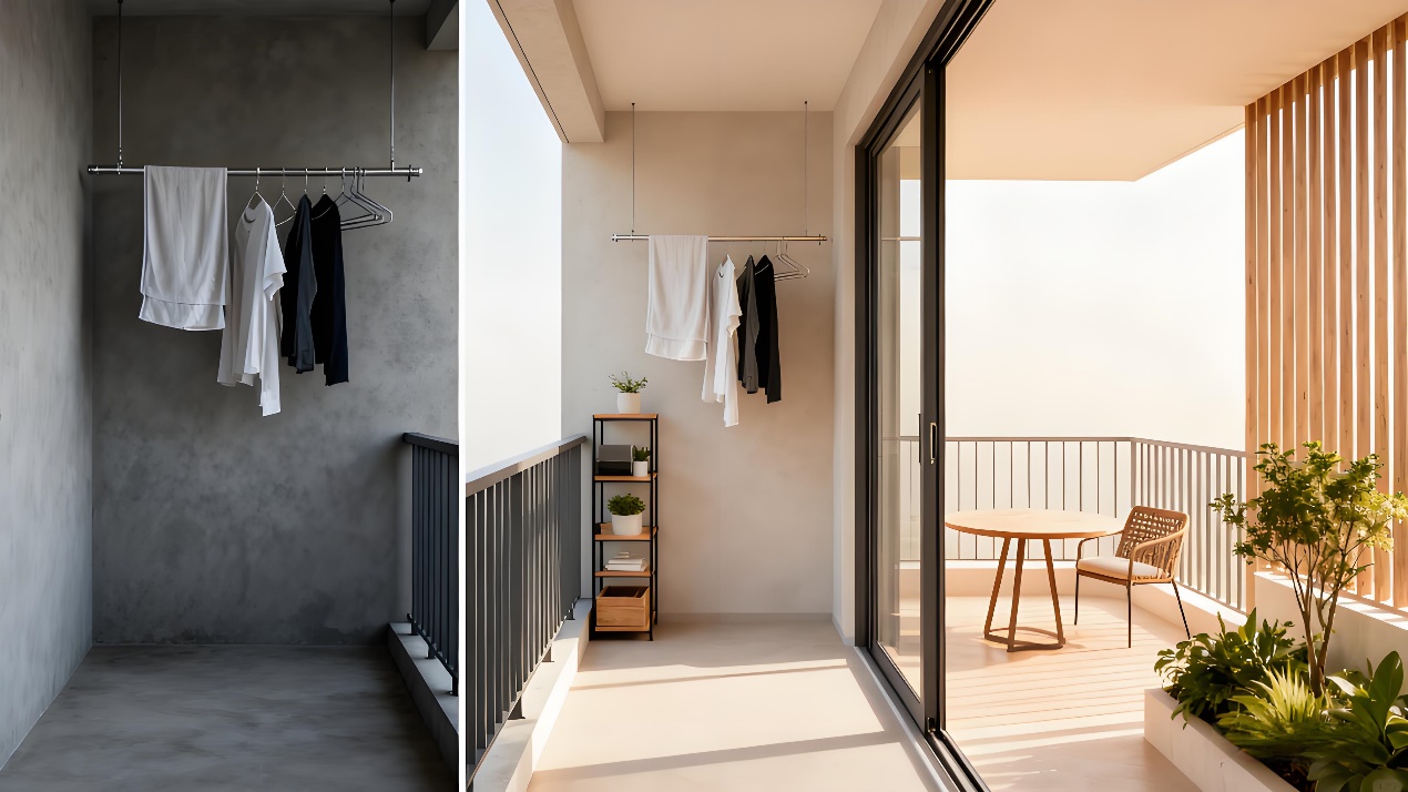 推荐配置:一套智能升降晾衣架解决刚需;一侧是壁挂式折叠书桌,放下就能办公喝茶;另一侧是阶梯式花架或嵌入式洗衣烘干机。墙面用洞洞板,将清洁工具、园艺小家什统统挂起来,地面零杂物。