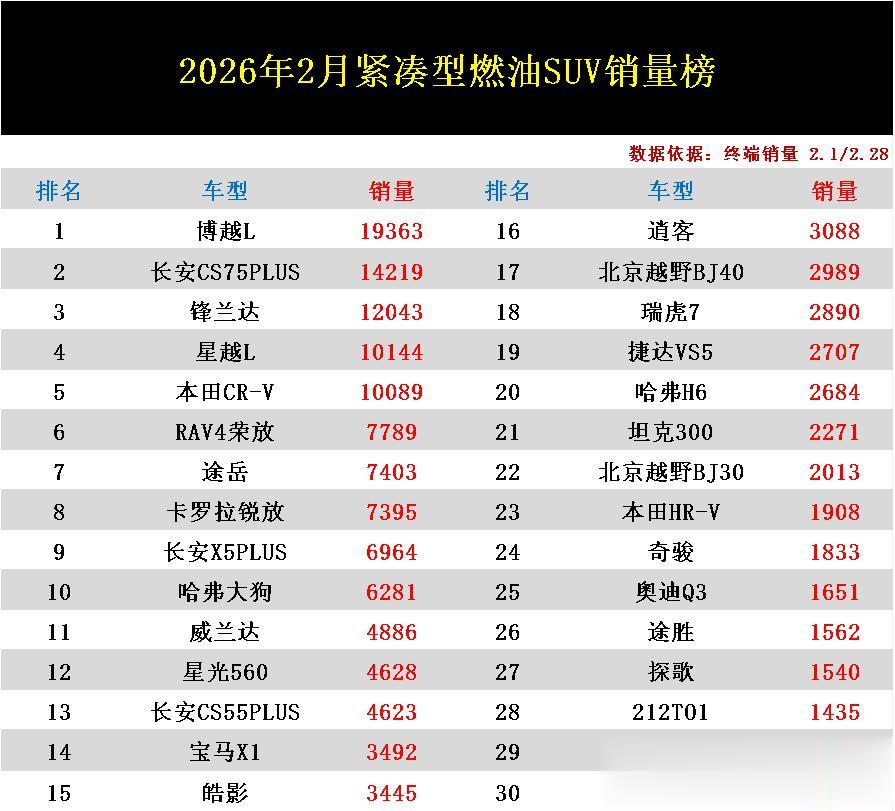 真难!2月紧凑型燃油SUV销量榜:合资惨败,博越L夺冠,皓影第15