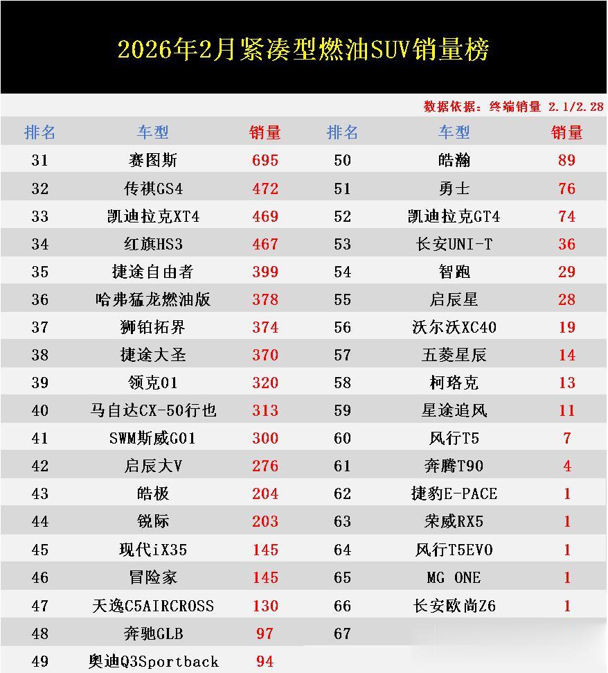 导读:日前,2026年2月紧凑型燃油SUV零售量排行榜已正式公布了!结局让人意外,内部排名已大洗牌,国产车已成为这个细分