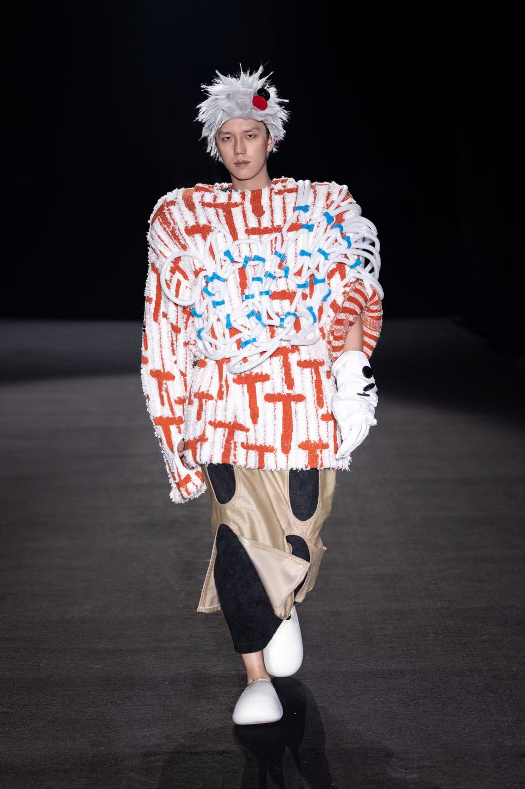 中国美术学院时尚设计学院的毕业生们,以“七十二变”为灵感源泉,在创作中实现身份的多元裂变与精神的深度凝聚,他们打破现实与虚拟、古典与未来的界限,将个人意识与集体记忆交织、历史文脉与未来想象融合,在经纬纤维间构建起多元维度的审美范式。这些作品或是数字技术赋能下的虚实共生叙事,或是传统萧山蕾丝工艺的当代转译,每一次材质的创新、每一处剪裁的巧思,都是对“变”与“不变”的艺术诠释,是设计师与时空对话、追寻“天地与我并生”境界的具象表达。