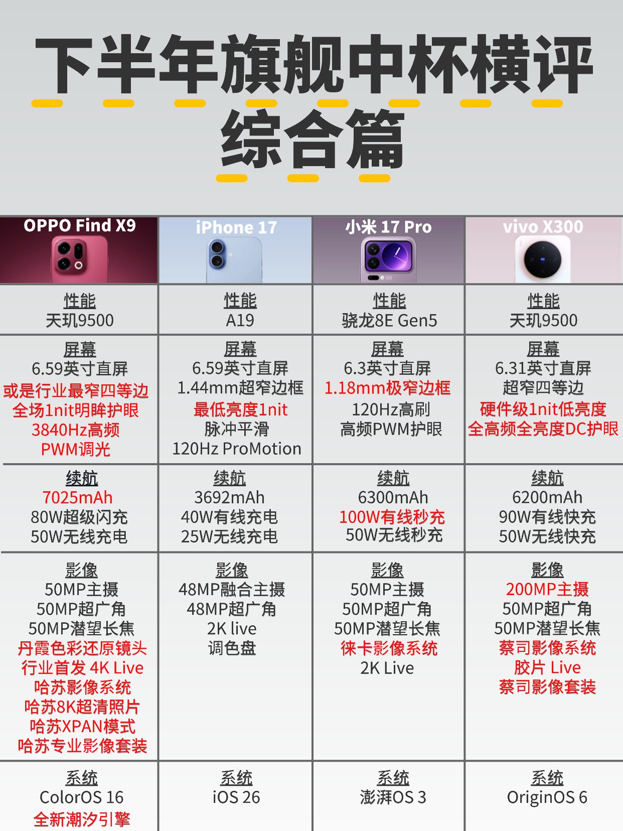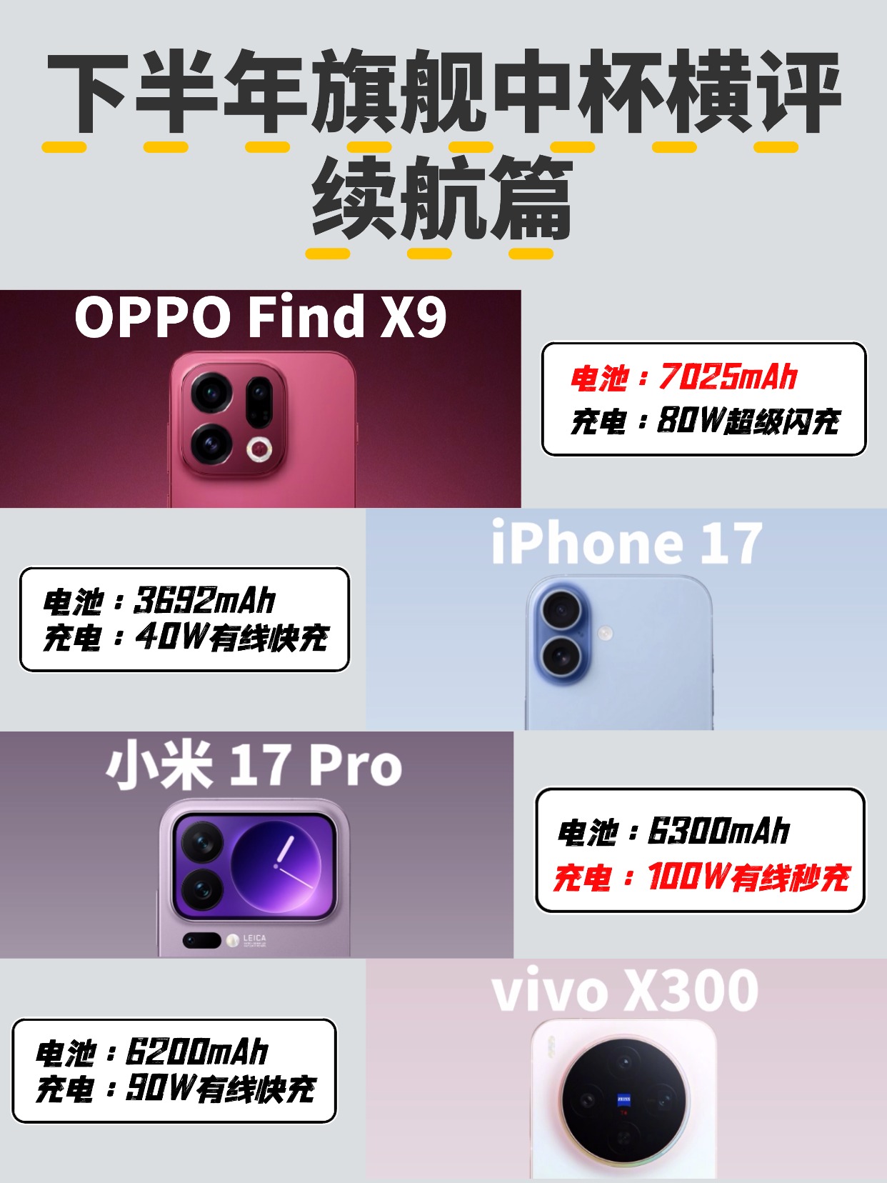 有没有人跟我一样,换新手机首要关注的是续航的?看了一下下半年已发布、未发布的旗舰中杯,讲真续航这块都蛮有到位的,其中像OPPO Find X9不仅给到了同档最大的7025mAh大电池,同时还配备了80W超级闪充,基础续航和充电功率都很nice,主打一个让人安心!