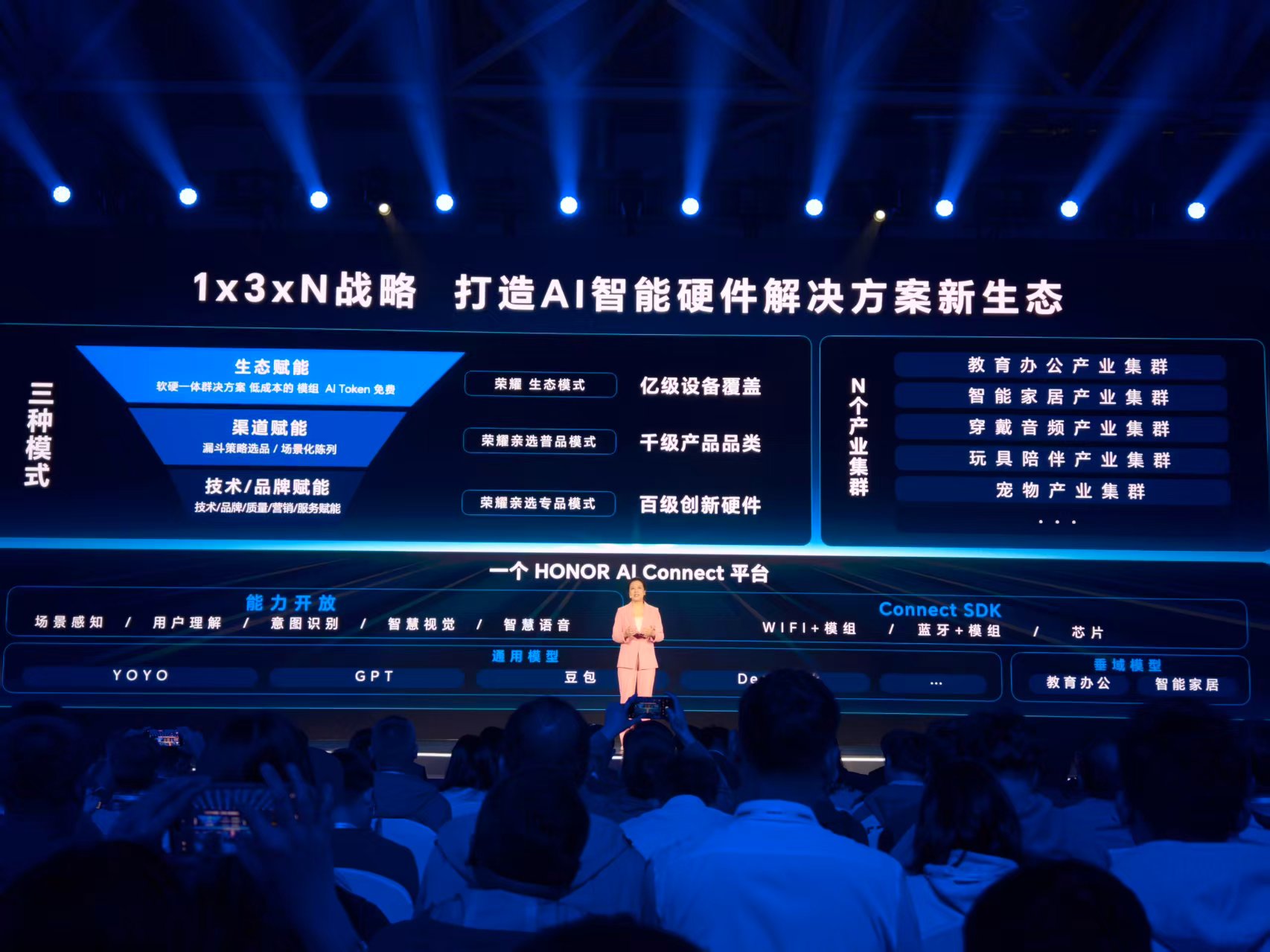 而「1×3×N」战略中的「3」,代表荣耀赋能生态伙伴的三种路径。生态赋能是技术开放,荣耀通过AI Connect平台输出语音、视觉等AI能力,让设备快速具备智能;渠道赋能是资源共享,依托荣耀的销售体系与旗舰店,为合作品牌提供展示与销售通路;技术与品牌赋能则提供研发支持与品牌背书,帮助伙伴提升产品竞争力与市场影响力。
