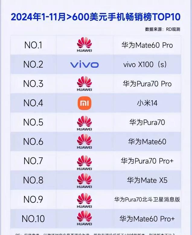 2024年1-11月,600美元手机畅销榜TOP10中,其中有8个是华为的机器,小米有1个,VIVO有1个,华为mate60系列有3款,pura70系列有4款,还有1款是华为的mateX5折叠屏。