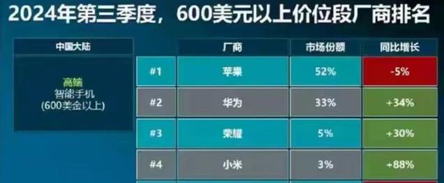 2024年第三季度,600美元以上价位国产厂家排名,苹果以52%拿下榜首,但同比增长为-5%,而华为以33%市场份额拿下国内第二,同比增长34%,荣耀以5%市场份额排到第三,小米以3%的市场份额排到第四。