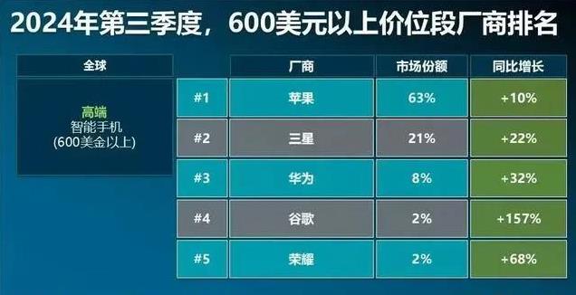 根据Canalys的统计,2024年第三季度,600美元(4380元)以上价位段国际厂商排名,苹果以63%的市场份额拿下榜首。