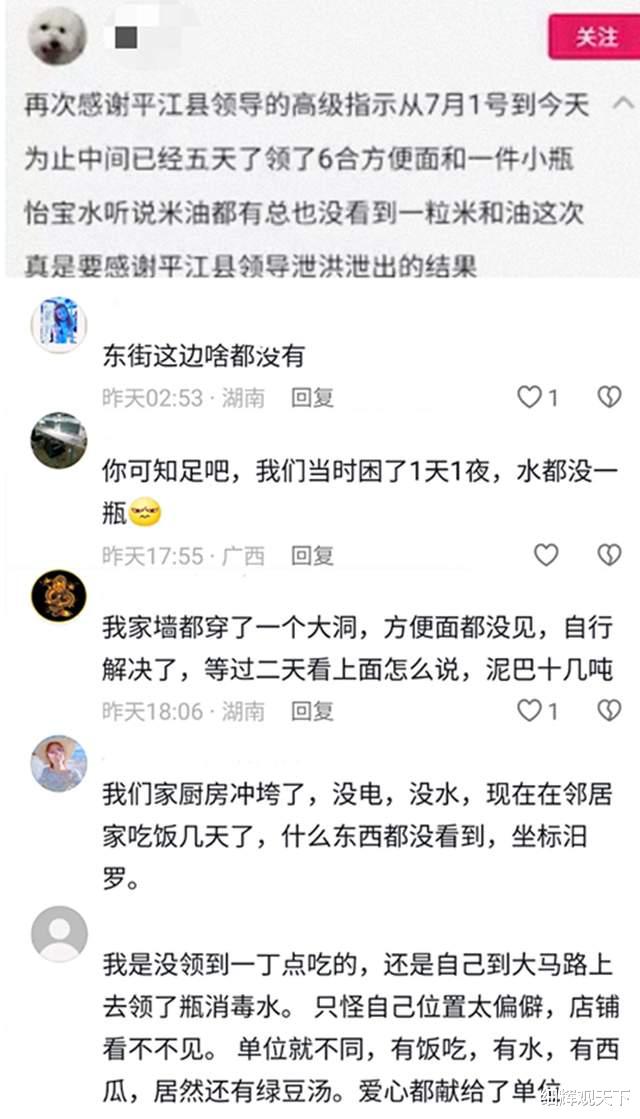 有平江县的当地居民吐槽,从7月1号开始到现在已经过去了五天,一共领了六盒方便面和矿泉水,没有米和油。