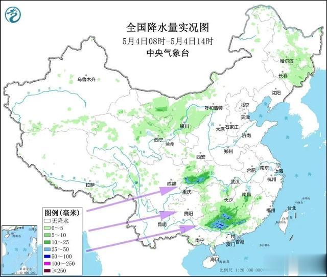 5月4日上午,在南方主要形成一北一南两片雨区,北是四川盆地东部的川渝地区,南是广西东北部、广东北部、湖南南部三省交界的南岭地区,并逐步向东移动。