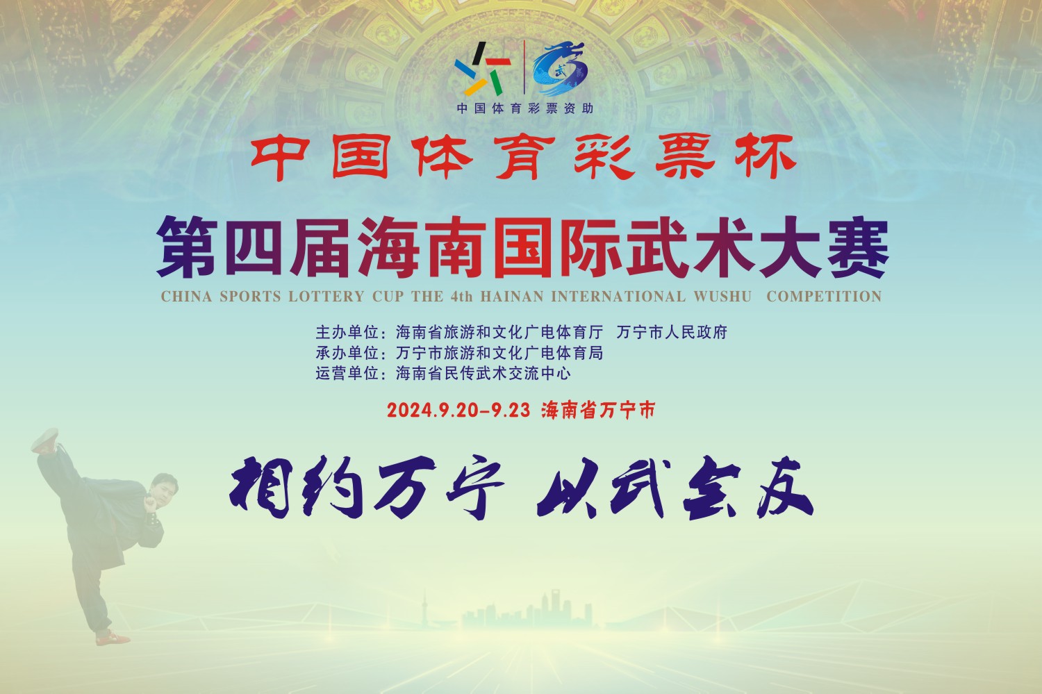 由海南省旅游和文化广电体育厅、万宁市人民政府主办,万宁市旅游和文化广电体育局承办,海南省民传武术交流中心运营执行的“中国体育彩票杯2024年第四届海南国际武术大赛”将于9月20日至23日在全国武术之乡——海南省万宁市举行。