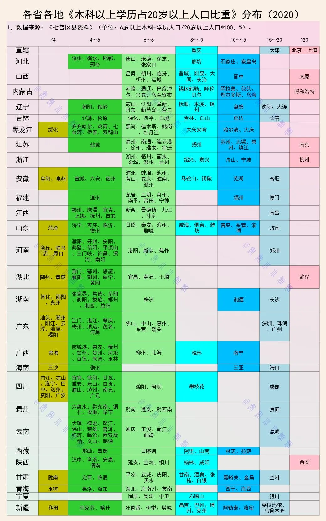 呼和浩特和太原这项比例也在20%以上,可能与图表选取的人口基数(只选取20岁以上人口,18岁和19岁这些本科在校生没作为计算的分母)有关,欢迎熟悉当地情况的网友给个答案。