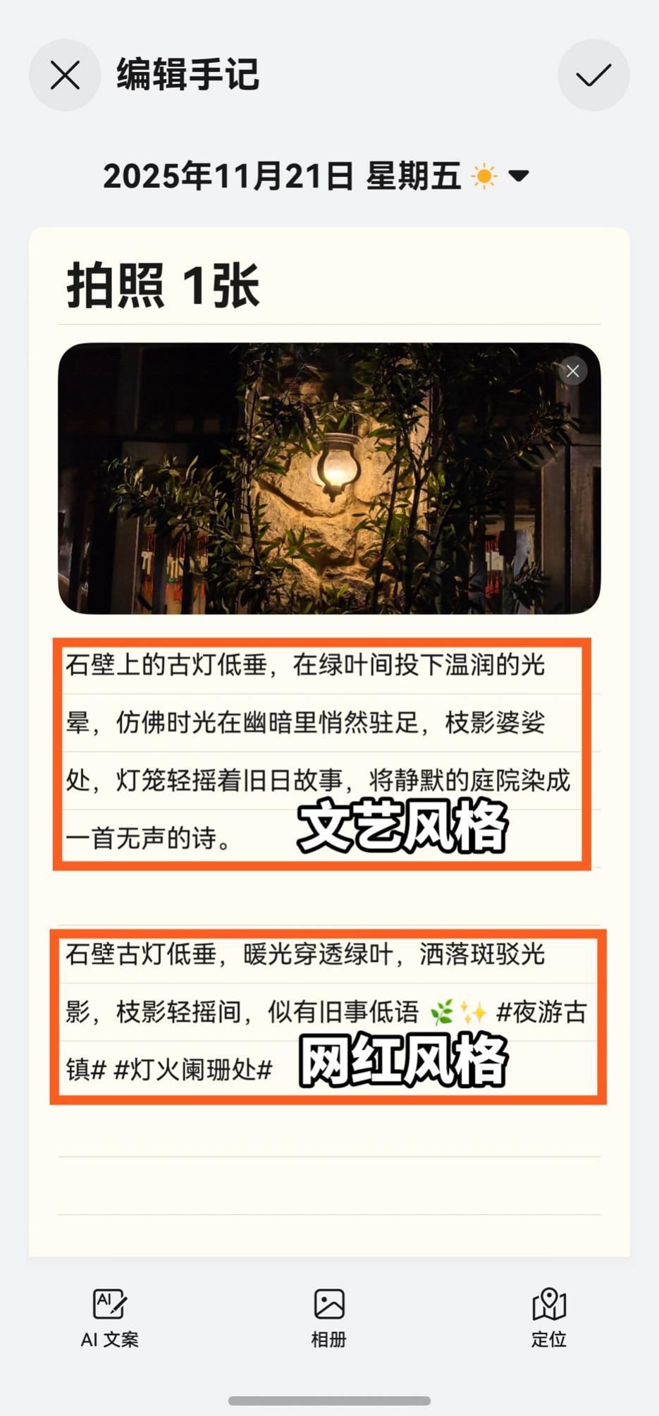 选好对应的照片组,就可以开始写下当时的心情、感悟,如果觉得自己写得不够满意,点一下右下角的“AI文案”,就能召唤小艺帮你润色成文艺风、现代诗风,或者适配小红书的网红风。与前两种风格不同的是,网红风会针对性地加上表情和话题,让文案看起来更完整、更出圈,完成后直接复制粘贴一发就完事。