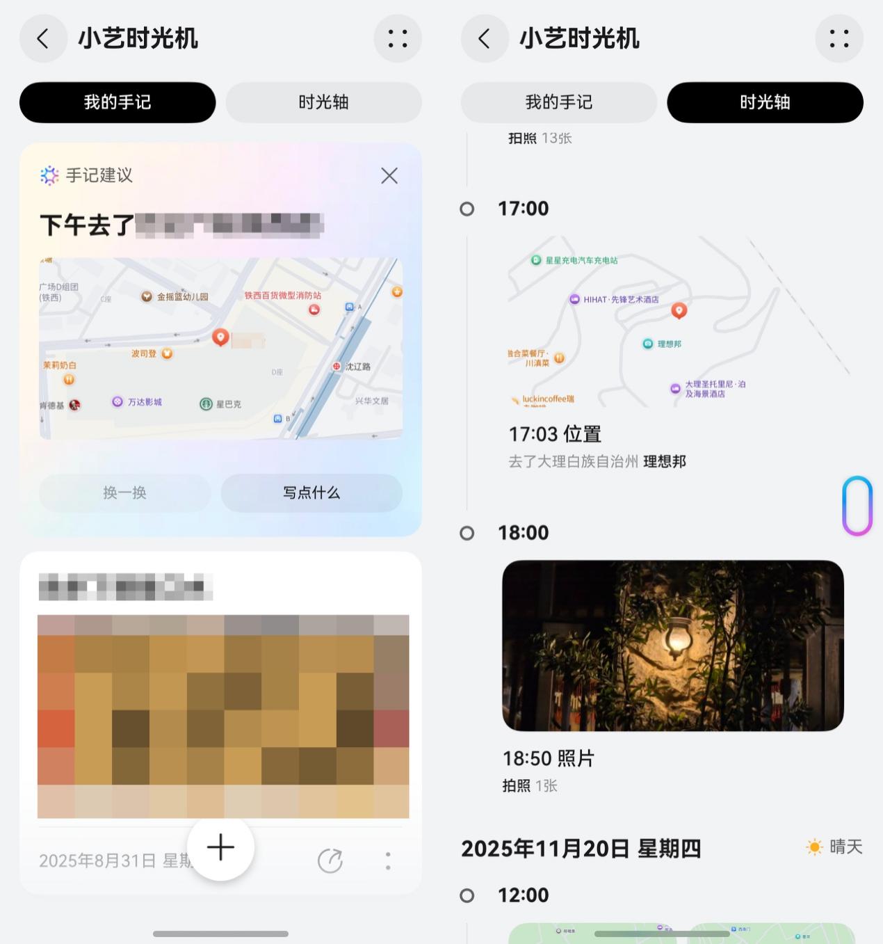 小艺时光机最打动我的地方,在于“温暖的陪伴”,TA不同于传统的日记应用,不仅能智能感知你的行程、照片和生活片段,自动为你记录生活轨迹,还有贴心的提醒。在开启小艺时光机后,它会在主页给你推送“手记建议”:"刚刚去过那家新开的咖啡馆,要记下今天的相遇吗?"这种恰到好处的挂记,让人感到被温柔陪伴。