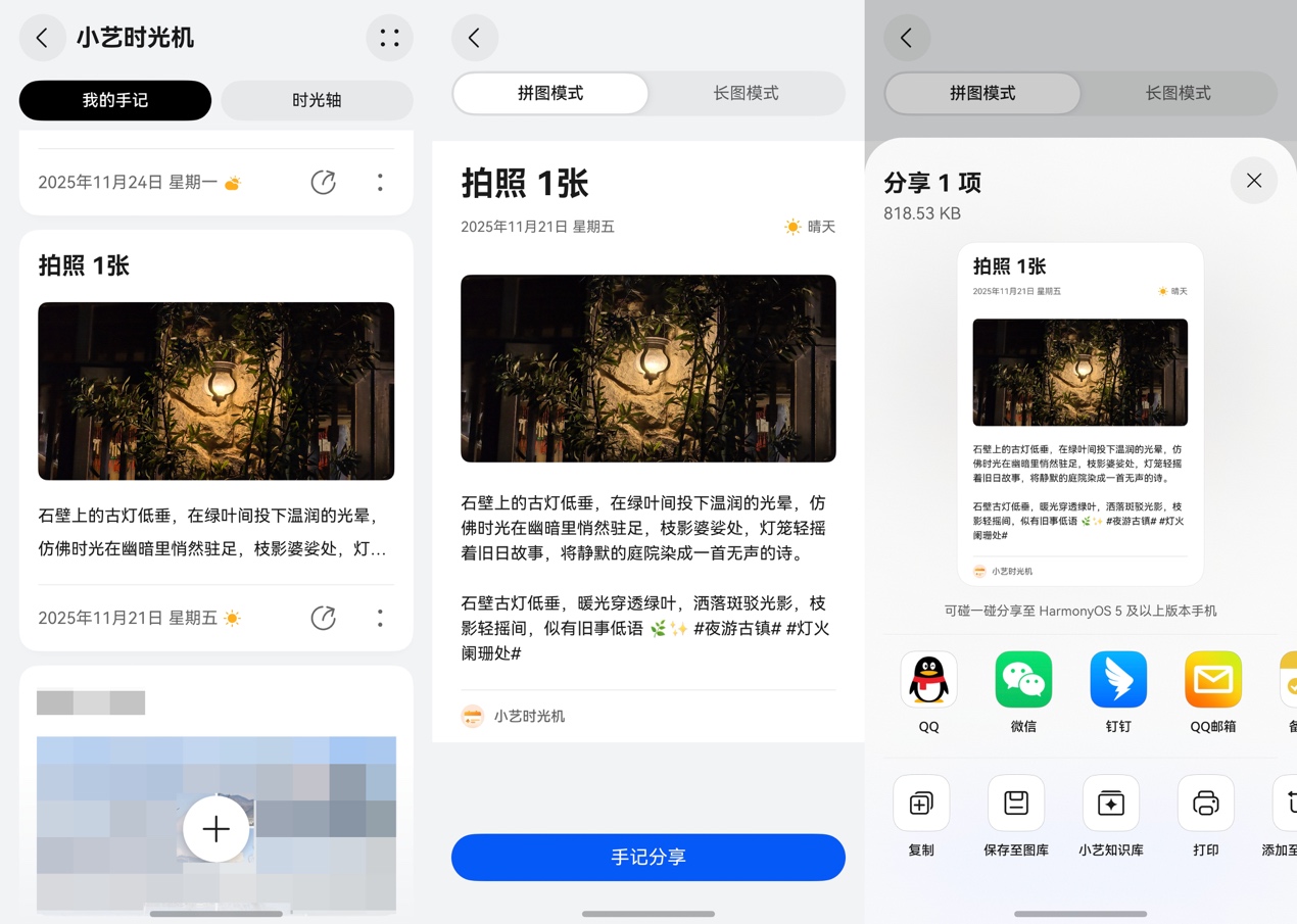 手记生成后,封面图会出现在小艺时光机主页的“我的手记”里,跟其他手记一起按照时间排序,随手一点就能回顾。另外点击分享,还能将手记内容生成一张拼图海报,分享到QQ、微信等社交平台上,和朋友们一起回忆当时的美好。