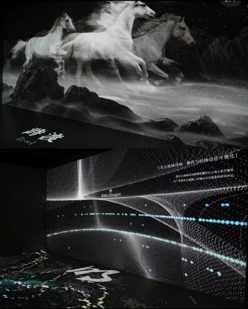 展览分为“江源启境”“江河汇秀”“中吴要辅”三大主题篇章,分别对应长江的自然起源、文化汇流与城市赋能。通过算法生成、数据可视化、沉浸式交互等数字手段,将诗词歌赋、非遗传承、地理变迁、方言密码等八大文化维度,转化为可听、可感、可互动的多维体验。