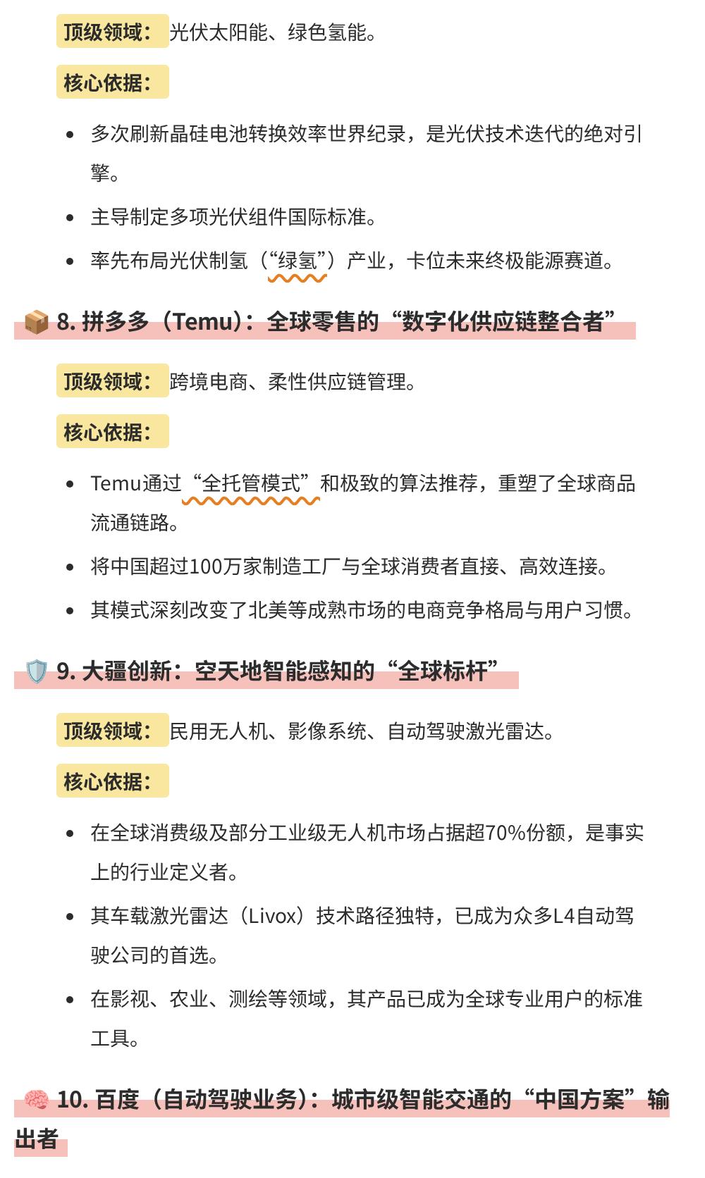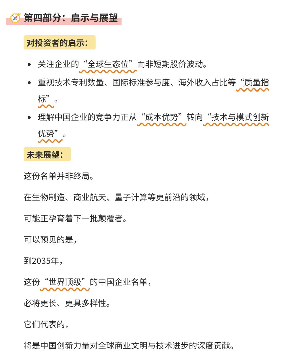 那时候跟几个外国同行聊中国企业,人家张嘴就是“你们的优势就是成本低”,我当时想反驳,搜肠刮肚除了几个互联网大厂,真没几个能拿得出手、在全球握有定价权的硬科技企业,憋半天脸都红了。结果去年再去德国慕尼黑展会,情况完全反过来了:欧洲客户拉着我问宁德时代的储能合作名额,本地经销商追着问比亚迪新款车型什么时候进欧盟,甚至做跨境的朋友跟我说,现在Temu在西班牙的渗透率高到当地商超都要跟着搞降价促销。看名单里的企业我真的挺有感触,我自己拿了隆基的股票快4年,中间最多的时候浮亏32%都没割,就是之前去银川的工厂调研,亲眼见95后工程师泡在车间里半个月,就为了磨0.1个百分点的电池转换效率,那种劲儿就知道,这种企业是真的在攒硬实力,不是炒概念。以前大家评判好企业总看市值看营收,现在这三个新标准真的戳到点了:要握技术定义权,要建自己的生态,还要真的能解决全人类的问题,不是跟在西方企业后面吃剩饭,是自己定游戏规则。其实哪是什么突然冒出来的顶级企业啊,都是熬出来的:华为被卡了这么多年憋出鸿蒙和昇腾,大疆被制裁多少次还是占了全球7成无人机市场,现在再看老外想卡我们脖子,也得掂量掂量自己有没有替代方案。之前总觉得“产业升级”是新闻里的词,现在看身边同学在华为做智驾,表弟在药明做新药研发,甚至我堂妹做Temu运营,把义乌的手工穿戴甲卖爆整个北欧,才知道这些企业的底气,都是每个干活的人拼出来的。接下来10年,估计还会有更多名字上这个榜,反正我是真的信,中国企业的好日子,还在后头呢。
