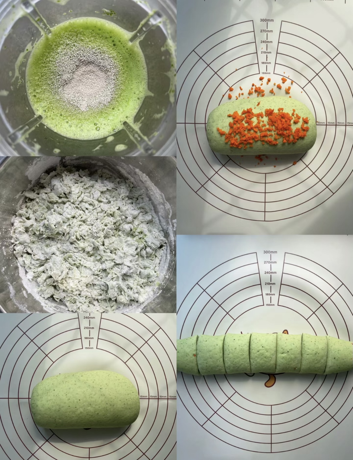 中筋面粉 300 克、黄瓜皮 35 克、冰水 130 克、酵母 1.5 克、小苏打 1.5 克、胡萝卜粒适量