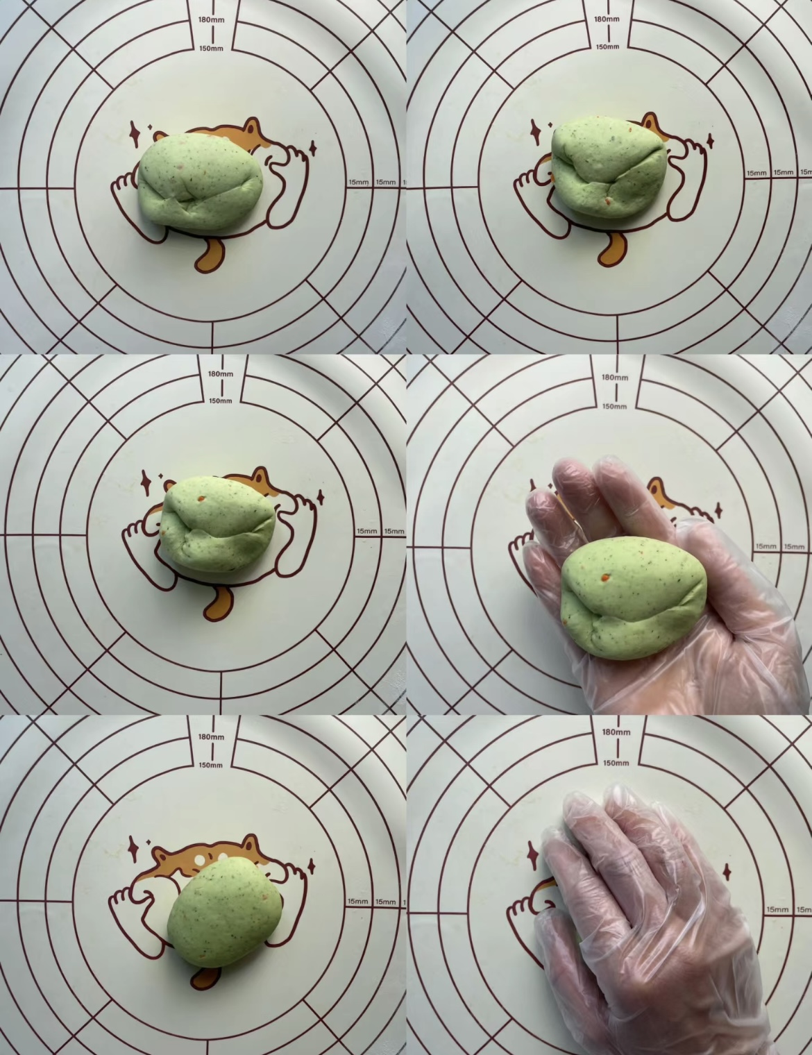 4. 取一个面团,用手掌根部从外向里折叠按压几次。然后在有纹路的那一面抹点水,把光滑面朝上放在揉面垫上,用手把面团包住,顺时针转圈,多转几圈,直到面团上的纹路几乎看不见了。最后再用双手把面团搓得高一点,一个漂亮的馒头生坯就做好啦。