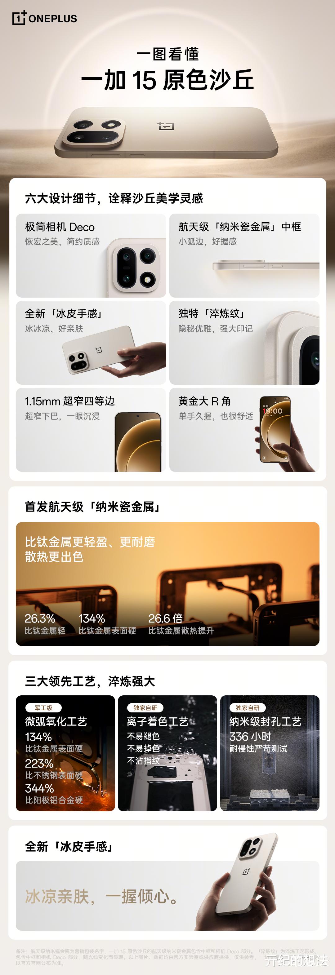 机身内置7300毫安时电池,标配120W充电器,还支持50W无线充电,这套组合还是向影像旗舰看齐了。一加15主打原色沙丘,机身采用了航天级纳米瓷金属,比钛金属(不是合金)更轻盈更耐磨,同时散热性能更出色,机身仅为211克(一加13机身为210克)。
