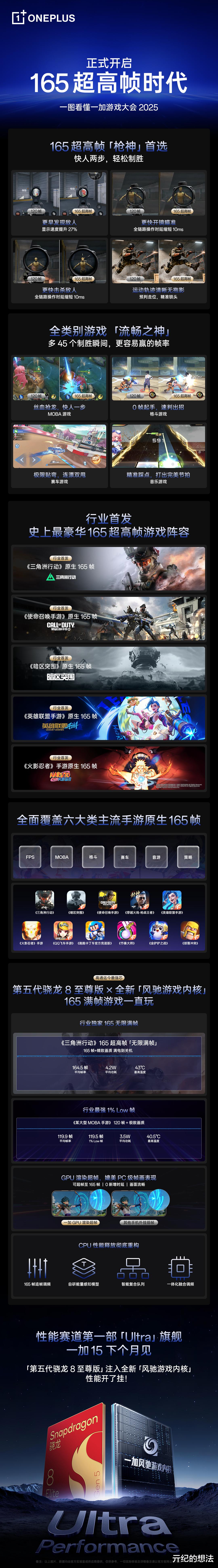 一加15首批搭载骁龙8Elite Gen5旗舰芯片,并且将出厂写出全新一代风驰游戏内核,顶配版大概率还是24GB+1TB,毕竟这次性能释放和游戏体验变成了核心卖点。在游戏方面,一加15的发力点是165Hz超高帧游戏生态,目前一加15已经适配了多款主流游戏,全面覆盖了六大类主流手游。