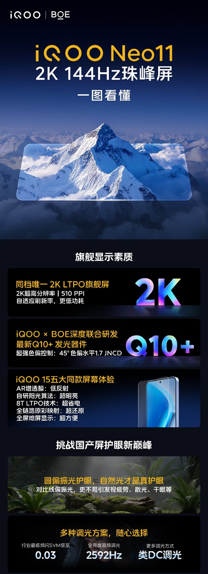 iQOO Neo11的2K 144Hz珠峰屏在多个维度实现突破。45°色偏水平达到1.7JNCD,色偏控制水平行业数一数二。护眼方面,搭载圆偏振光护眼技术,更接近自然光的显示,相比传统的线偏振光更不易引发视疲劳;具备全新一代悦目护眼2.0,支持全场景、全天候、全人群护眼,全亮度2592Hz高频PWM调光和类DC调光,SVM值达到0.03,实现行业最低频闪。