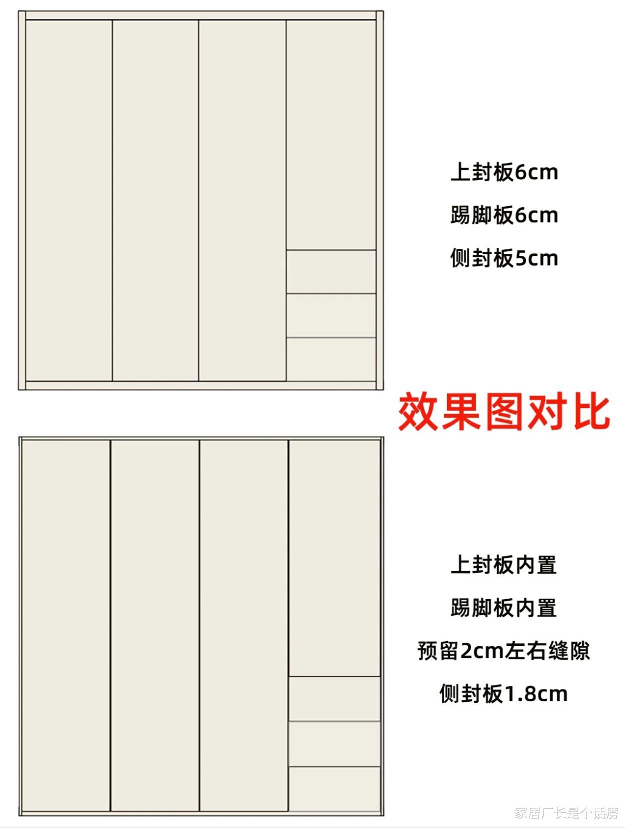 柜子四周被宽大的收口板全方位包围,像给柜子套了个厚重的相框。不仅视觉上笨重,还会让柜门看起来小了一圈,空间感瞬间被压缩。