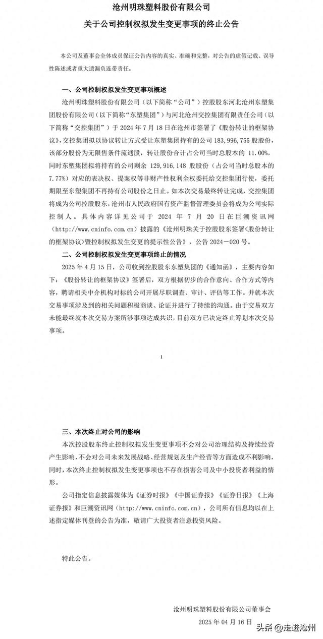 交易终止 ! 沧州国资委不再”接手”沧州明珠了。