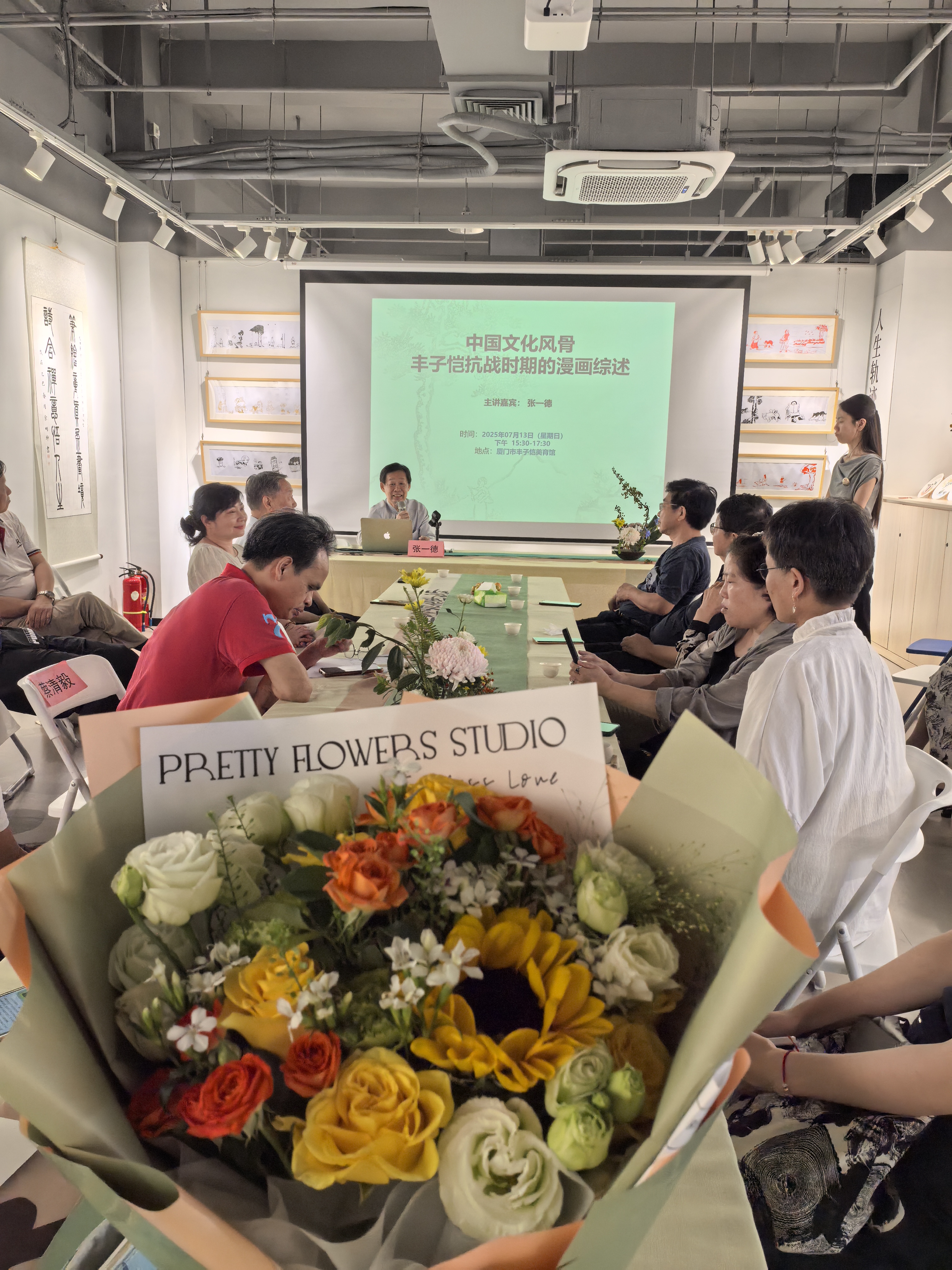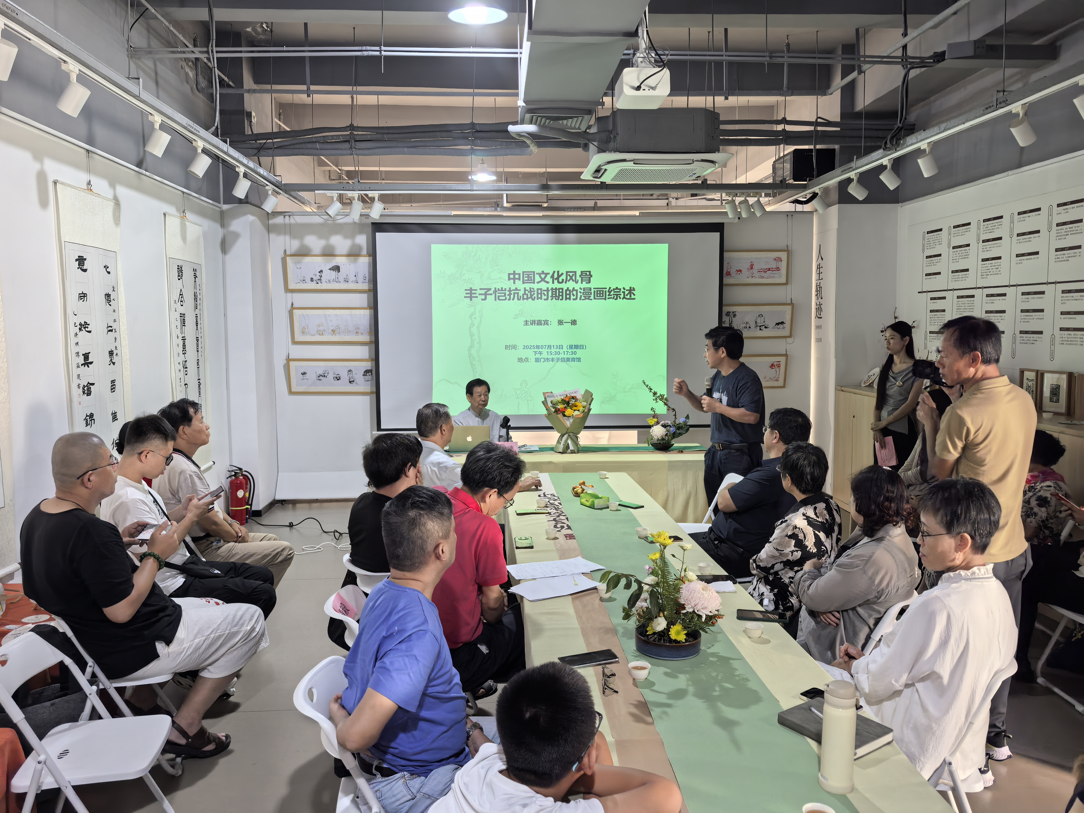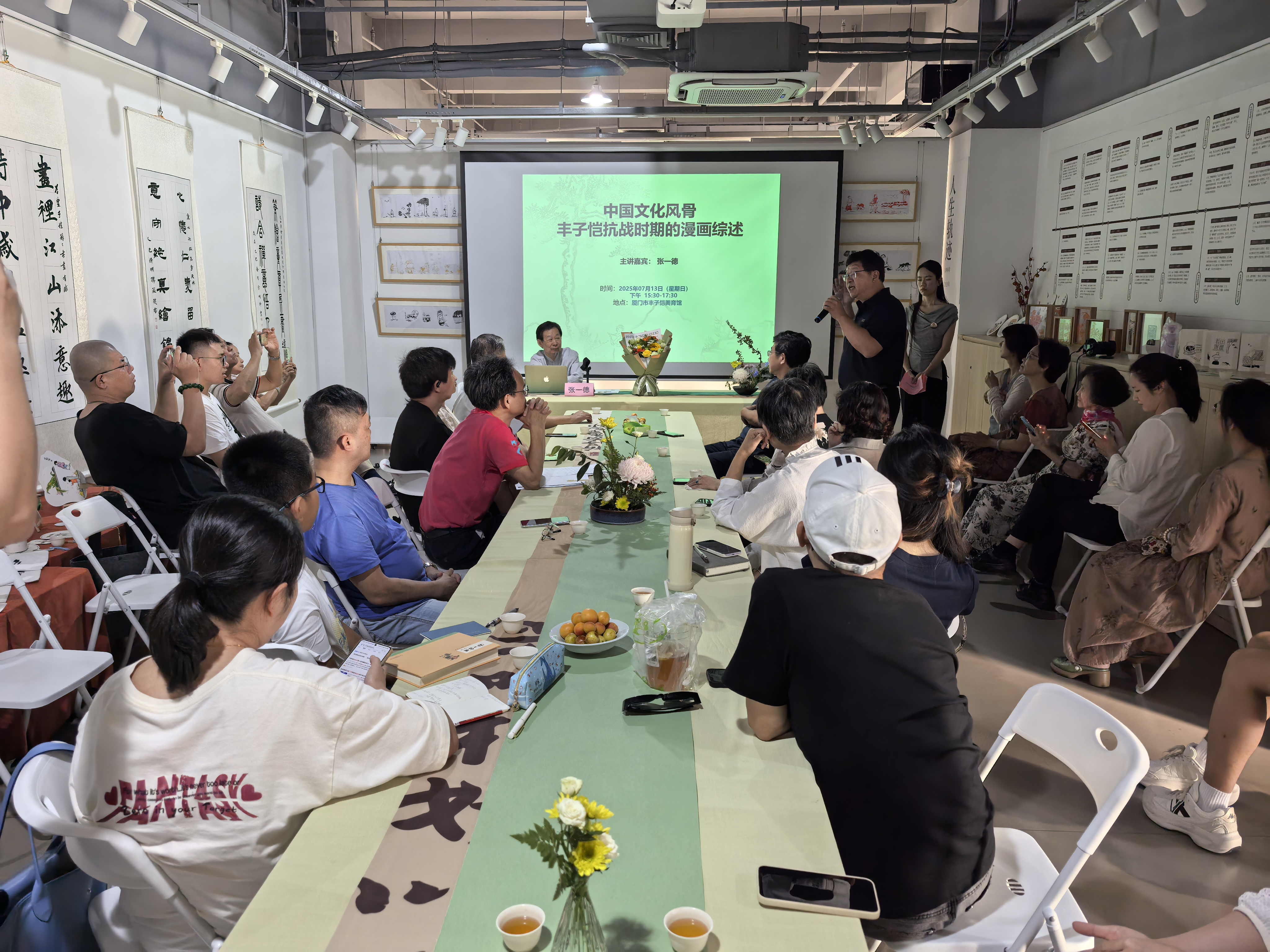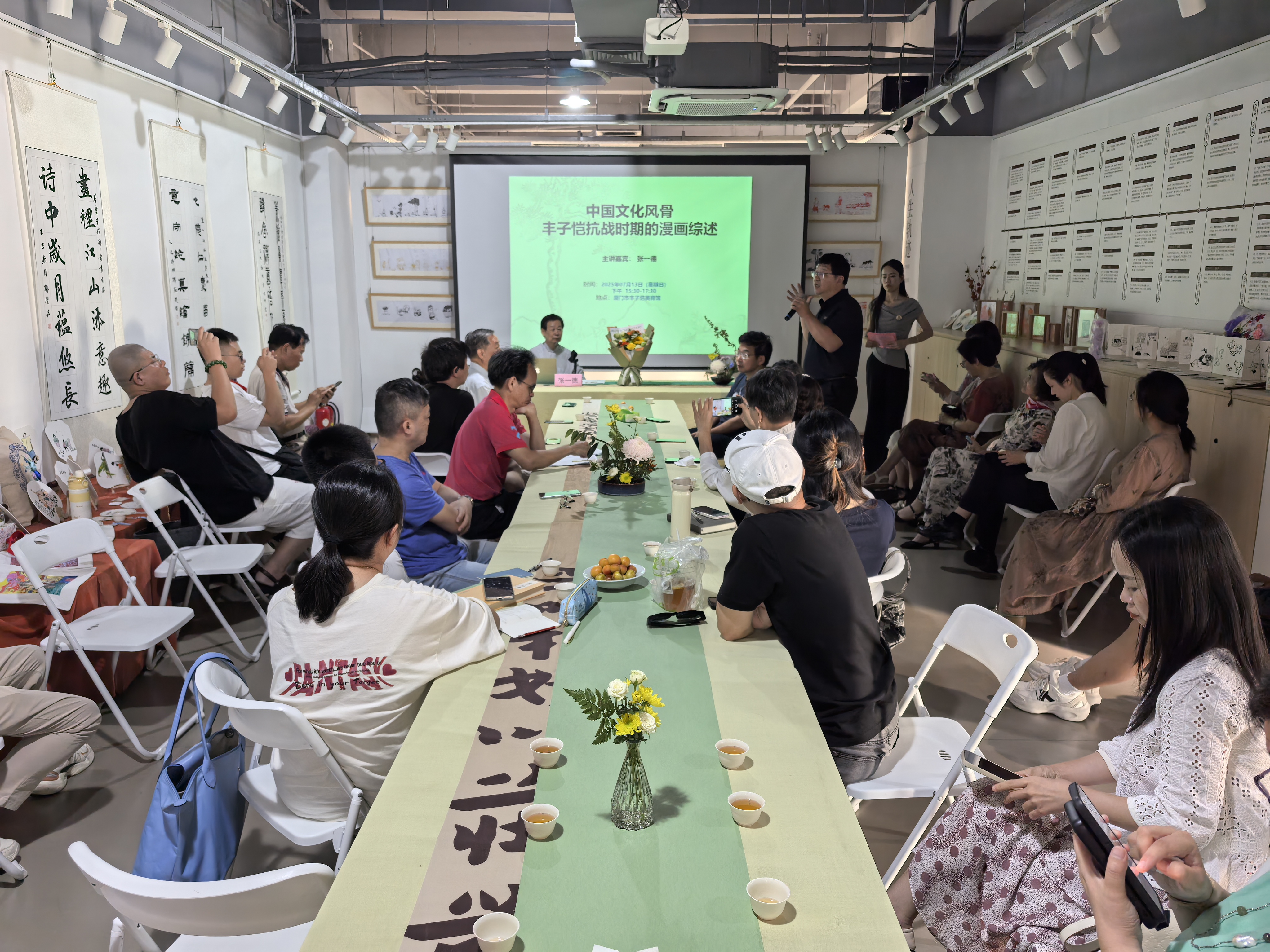 纪实新闻报道:《“漫绘时代”系列讲座厦门开讲:丰子恺抗战漫画中的文化风骨与弘一大师精神共鸣》2025年7月13日下午,由厦门丰子恺美育馆主办的《“漫绘时代”——丰子恺与丁聪的艺术回响》系列公教活动之《中国文化风骨——丰子恺抗战时期的漫画综述》讲座暨“喝茶论道-弘一大师读书分享会(第十八回)”在厦门圆满举行。活动以艺术研讨与人文对话的形式,吸引了众多文化学者、艺术爱好者及社会人士参与,现场氛围热烈而深沉。