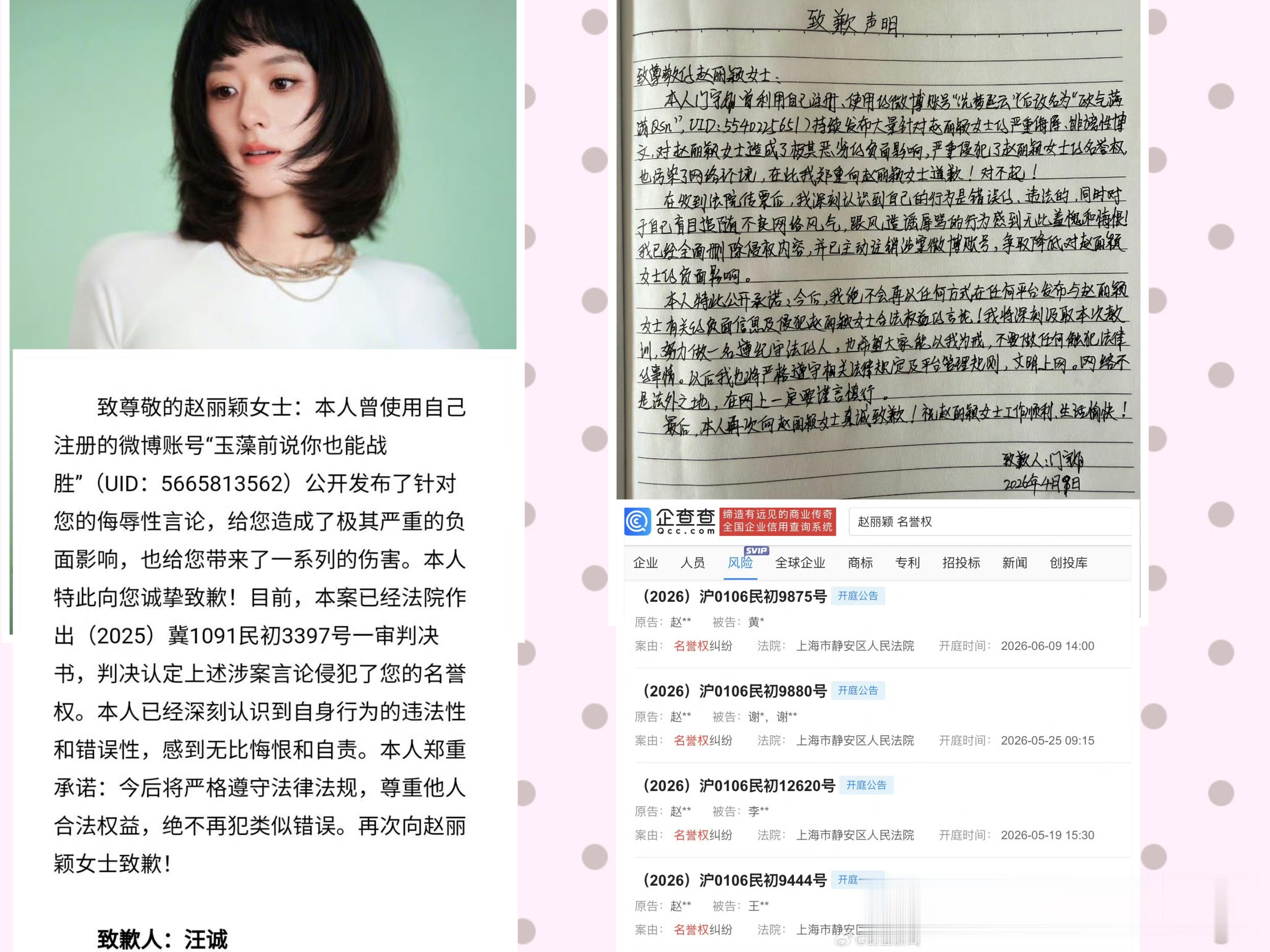 事实上,赵丽颖早已长期对抗网暴。2025年11月,她就起诉卯某、汪某侵犯名誉权,索赔15万元。如今多起案件已宣判结果,汪某连续多年发布侮辱言论,最终被判登报公开道歉并赔偿8万元,道歉声明刊登在《人民法院报》;门某发布诽谤内容,主动发布视频与手写致歉信;B站用户制作诽谤视频,被要求置顶道歉90日并赔偿8万元。对于拒不执行赔偿的被告,法院直接强制执行,6人被限制高消费,夏某被列入失信被执行人名单。