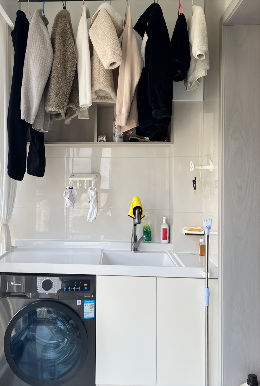 上面是晾晒衣服都地方,下面是洗衣机,每次洗完之后顺手去晒在上面非常方便,完全不会占据多余的空间。如果你不想去做晾衣架,也可以去做洗衣机搭配烘干机的方法,比晾晒衣服会省事。