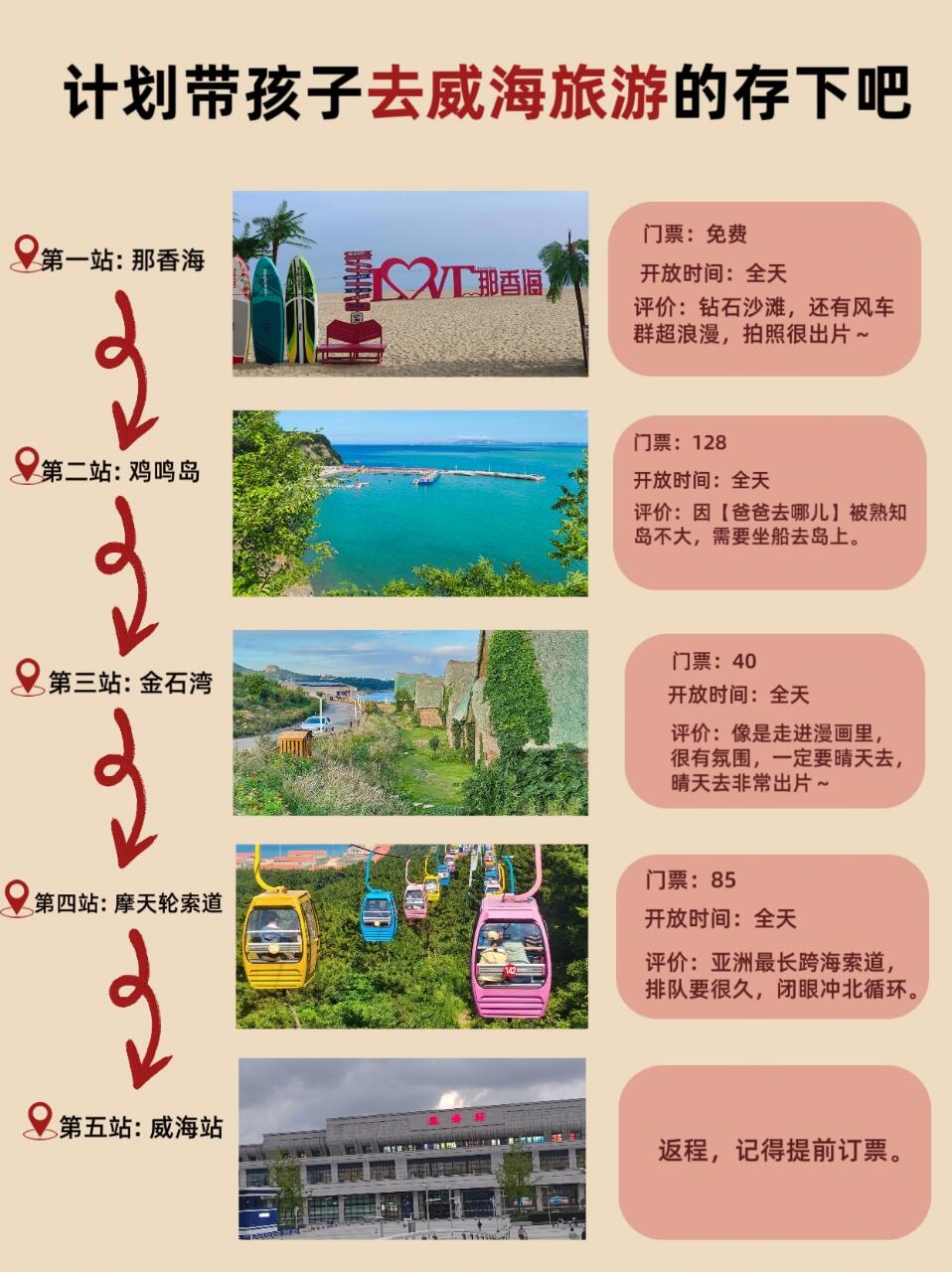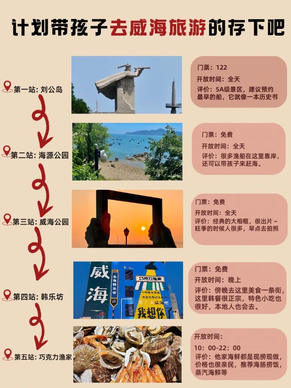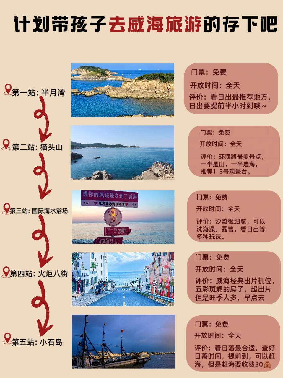 ①交通:环海路单行道多,带娃建议打车+公交混搭(用“威海公交集团”查实时位置)