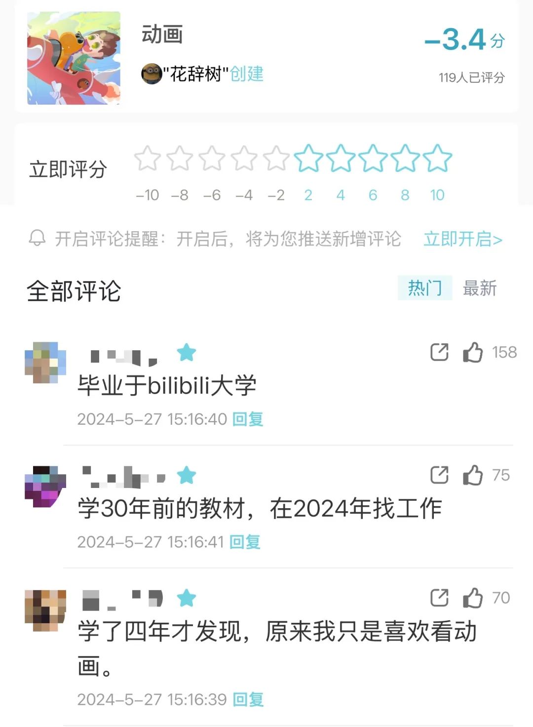 首先要讨论的是,动画相关专业的学生们可以在学校学到什么专业知识呢?大概率是看10-20年前出版的教材,用20-50年前的案例,讲近100年的动画史,然后画画,写生,交作业。即使是某些排名前列院校的动画专业学生,在互联网上经常讨论的话题也会是“报线下班还是学线上课?”“大二报班是不是来不及了?”“不报班真的不行吗?”等问题,给人一种明明上了动画专业,却还要三分天注定七分靠自己的悲凉。在浪花waves的大学专业评分中,动画专业的热评第一是“毕业于bilibili大学”。