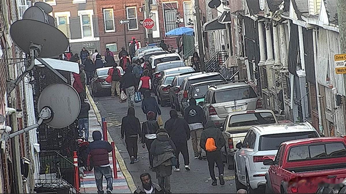 在周五宣布采取打击行动之前,监控拍到了费城一个被认定为露天毒品市场的街区内聚集的人群。