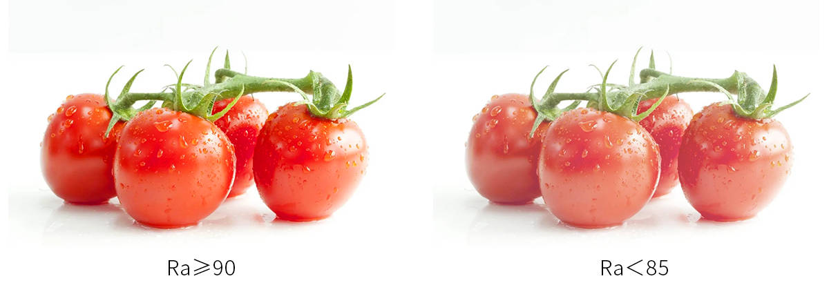 台灯的显色主要看两个参数:Ra与R9。这两个参数影响着我们看到的物体颜色。比如下图,西红柿在Ra与R9大于90的台灯下是红色,在低显色台灯下看起来颜色偏暗。对比之下,我们可以得出这样一个结论:Ra与R9大于90的台灯可选,这种台灯显色效果好,更能保护孩子的视力。相反,低显色台灯会降低孩子对色彩的敏感度,影响孩子对色彩的感知力。