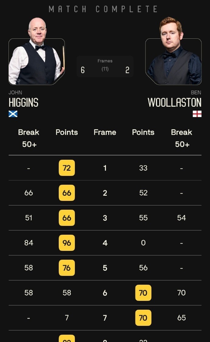 希金斯对沃拉斯顿开局5-0,最后让对手追两局才收尾。希金斯连杆破百都没打出来,但对手更菜,失误更多,比赛就这样了。