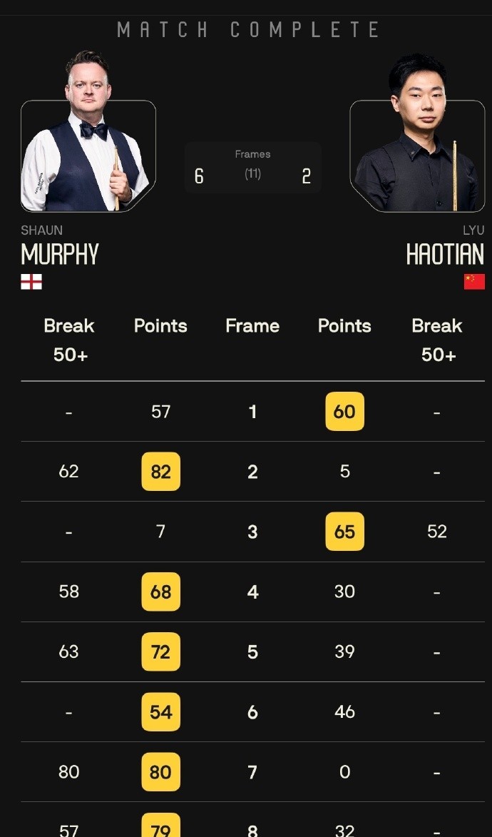 墨菲和吕昊天打到2-2平后,突然爆发连赢四局。吕昊天后面几局机会没抓住,最后2-6输掉。这场本来能有惊喜的,但实战能力差了一截。