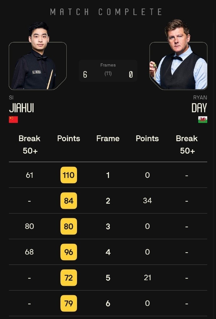 最先赢的是斯佳辉,他碰上瑞恩戴打出了6-0。虽然只有3杆50+,但整场比赛没给对手机会。瑞恩戴状态差,原本该拿的分都丢了,被零封也是实锤。