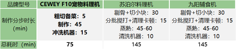 CEWEY F10宠物料理机只需要粗切食材5分钟,自动拌匀烹煮45分钟,自动清洗15分钟,总共一个多小时,而且需要人工操作的实际时间其实就10几分钟。