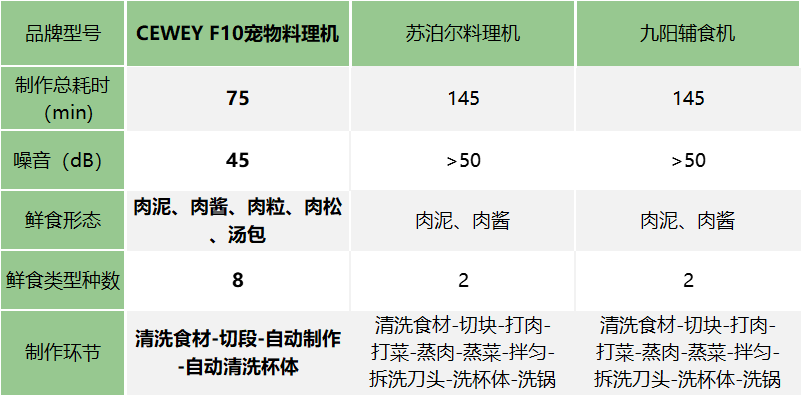 我把 CEWEY F10宠物料理机和另外两台苏泊尔料理机、九阳辅食机摆在一起测试。它们的设计思路完全不一样,所以使用效果也差得挺远。