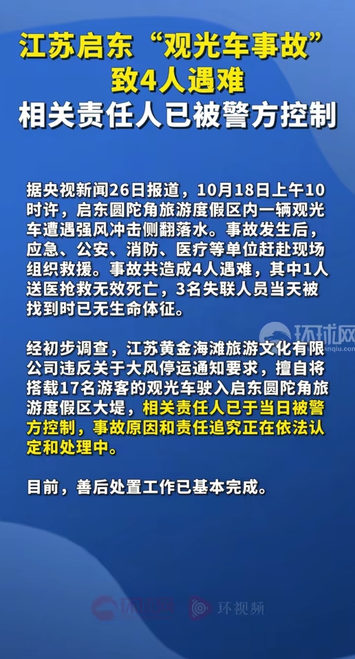 10月18日,南通启东市。一趟带着游客看海的小火车把四名游客直接送进冰冷的海底深渊,本该是浪漫惬意的旅行,转瞬之间变成了阴阳两隔的悲剧。