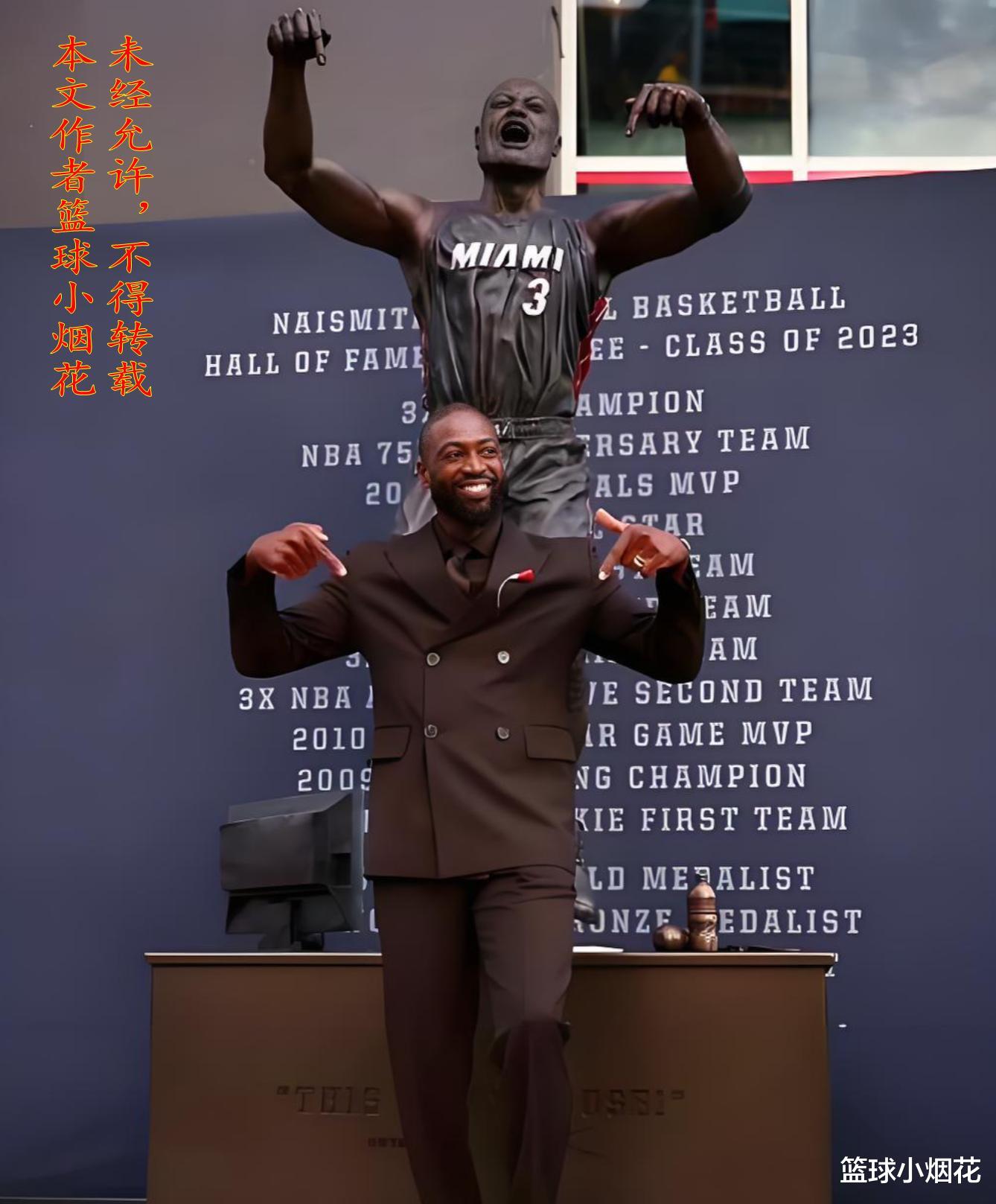 2024年10月27日,韦德又迎来了自己职业生涯第三个高光时刻,这一天韦德亲手揭幕了自己的铜像,要知道这份荣誉在某些方面甚至比入选名人堂都要珍贵,入驻名人堂的球星现在两三百人是有了,但有资格立铜像的球星,NBA八十多年的历史一共就二十来个,不过从这一天起,韦德就是这其中之一。