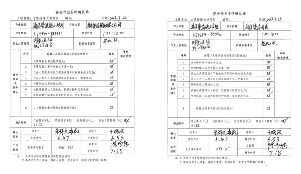 项目部聚焦现场管控痛点,构建了一套“全时段覆盖、全流程闭环”的管理体系,让安全措施看得见、摸得着、落得实。制度执行“硬起来”。严格推行管理人员与作业班组同步上下班的跟班作业制度,明确规定“现场有工点,就有管理人员在岗”,每班施工前,必须完成安全条件确认——作业面是否有积水?防护栏杆是否牢固?特种作业人员证件是否有效?确认无误后才能开工。此外,严格执行“一会三卡”工作要求,每班作业前结合班前喊话将“作业要点卡”、“风险提示卡”、“应急明白卡”宣贯到位,确保作业人员熟练掌握当班施工的作业要点、潜在的安全风险以及针对不同事故类型应采取的应急处置措施。