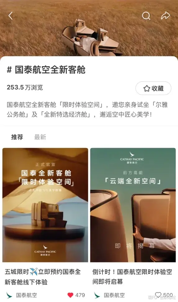 线下体验活动“国泰航空全新尔雅公务舱和特选经济舱”全国巡展,横跨上海、北京、深圳、成都、广州五大城市,吸引超过4万人次进场,近7000人参与座椅体验。线上社交话题同样火爆——在小红书主阵地,#国泰航空全新客舱#话题热度持续攀升,总浏览量突破250万,产生超过3000篇优质体验UGC。媒介投放聚焦高品质商旅人群并辐射泛旅行圈层,通过高端商圈户外广告投放+主流及商旅APP等Digital投放+社交平台的全方位媒介组合,带来1.8亿总曝光。
