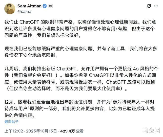 OpenAI老板奥特曼正式宣布,今年12月将推出一个支持成人主题对话内容的ChatGPT版本,包括成人颜色内容,仅限于通过验证的成人使用。