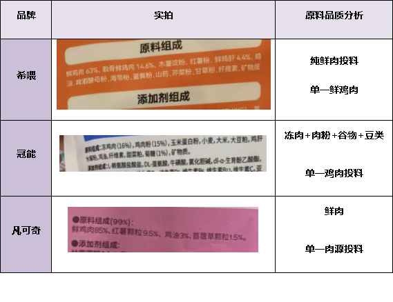 凡可奇这款猫粮用的是纯鲜肉投料,肉源分别是鸡肉和鸭肉,还加入了0.5%的鱼油成分,整体的营养与包装袋标注值基本吻合。